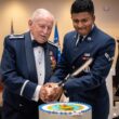 Retired U.S. Air Force Col. Len Augustine and Airman 1st Class Jayden Chetram, 60th Communications Squadron network/infrastructure technician, cut the cake during the 76th Air Force anniversary gala at the Sunrise Banquet Hall, Vacaville, California, Sept. 16, 2023. Team Travis came together to celebrate 76 years of Air Force history and heritage. It is customary for the most senior or oldest Airman and junior or youngest Airman to cut the cake. (U.S. Air Force photo by Tech. Sgt. Philip Bryant)